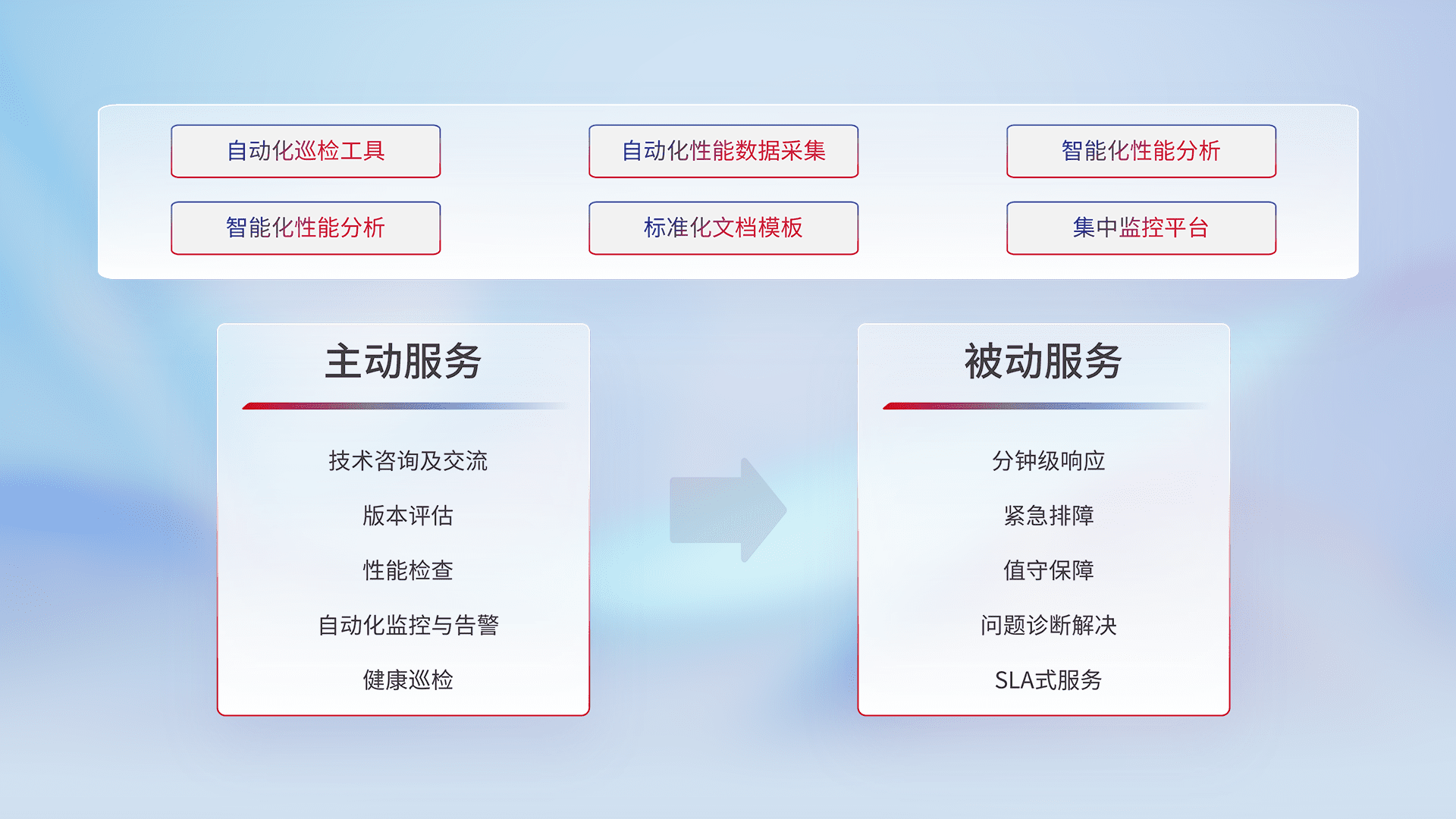 智能化工具和标准化文档,,,保障服务质量,,提供主动服务(包含技术咨询、、版本评估、、性能检查、、、、自动化监控与告警、、健康巡检)和被动服务包含(分钟级响应、、、紧急排障、、、值守保障、、、、问题诊断解决、、、SLA服务)。。。。